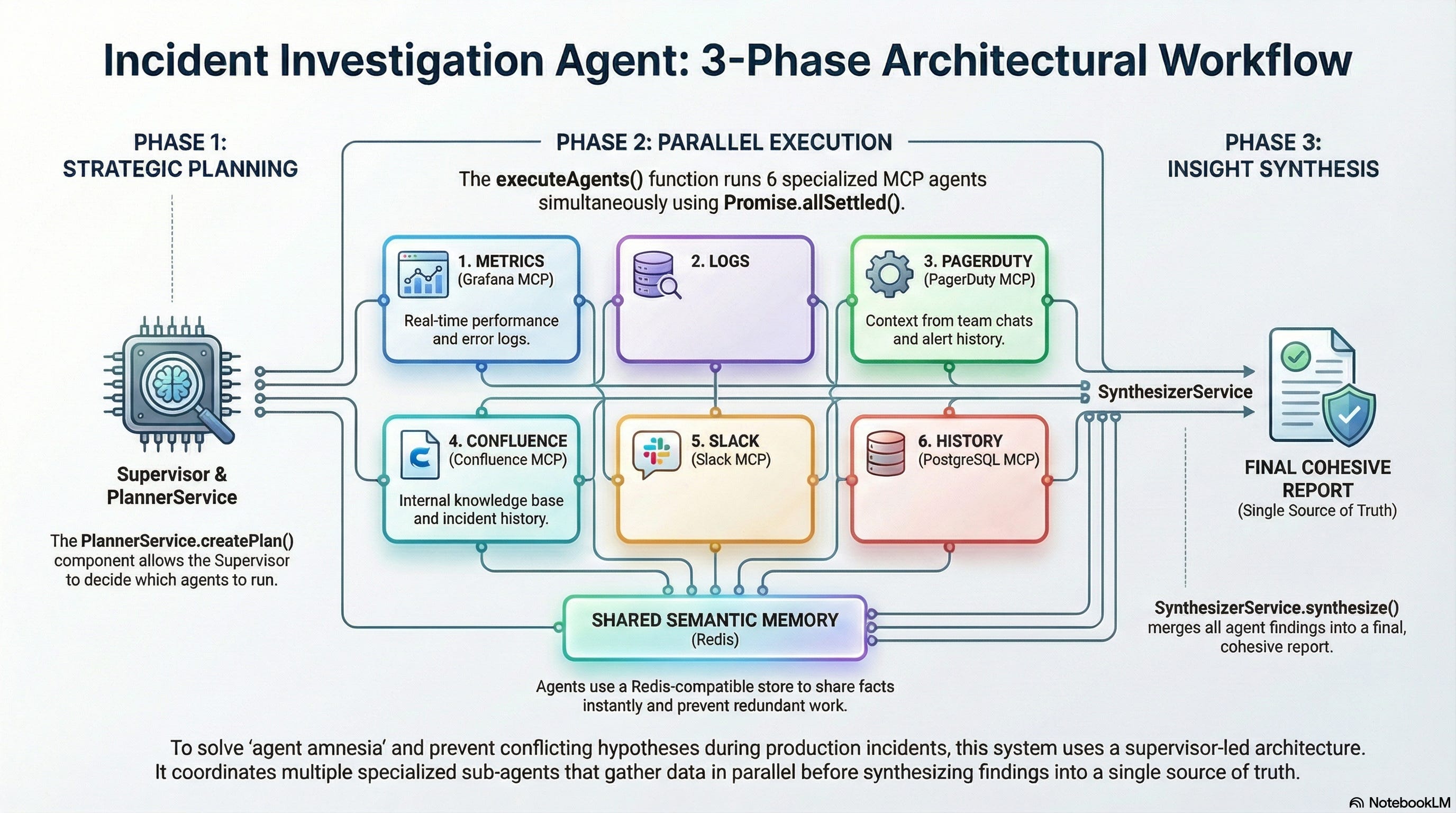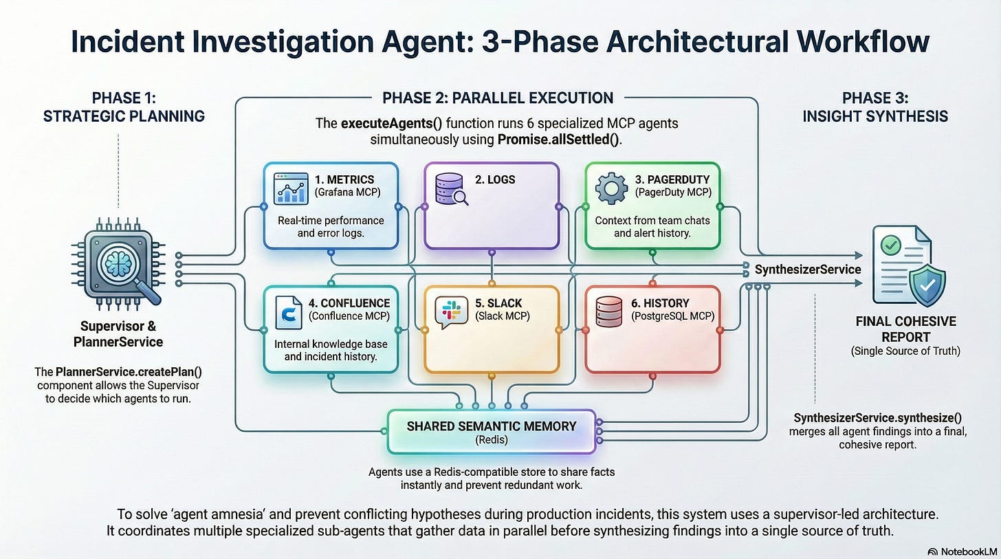 About six months ago, we were building an agent for investigating production incidents. The architecture is fairly standard for these systems: a Supervisor receives an alert, creates a plan via PlannerService, then fires off a batch of sub-agents in parallel using Promise.allSettled(). Each sub-agent goes to its own data source, digs up what it can, and then a Synthesizer assembles their findings into a final report.