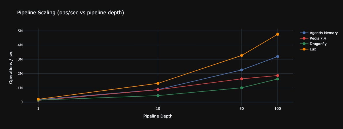 At pipeline depth 100 — 3.19 million ops/sec. That’s 1.71x Redis. This is where virtual threads and the absence of a single-threaded event loop start to shine: when requests come in batches, a multi-threaded architecture scales far better.