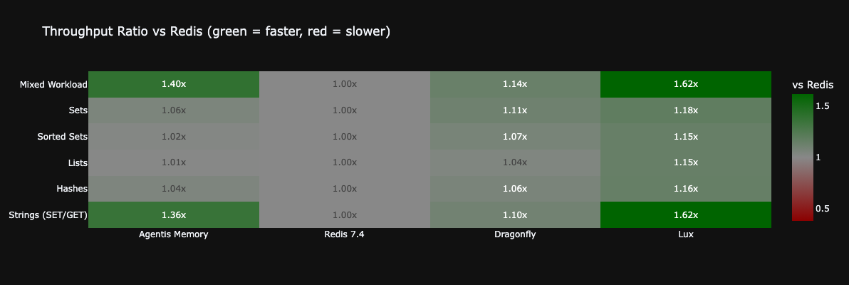 On strings — 1.36x Redis. On mixed workload — 1.40x. Lux is faster (1.62x) — no illusions there. But Lux doesn’t have built-in vector search, and that’s a fundamental difference.