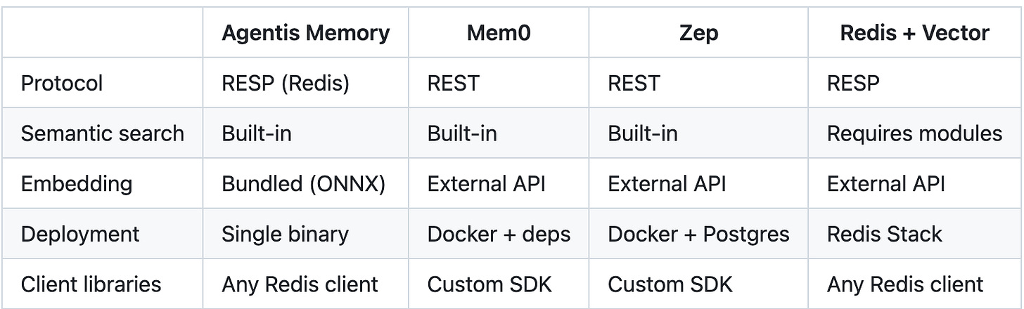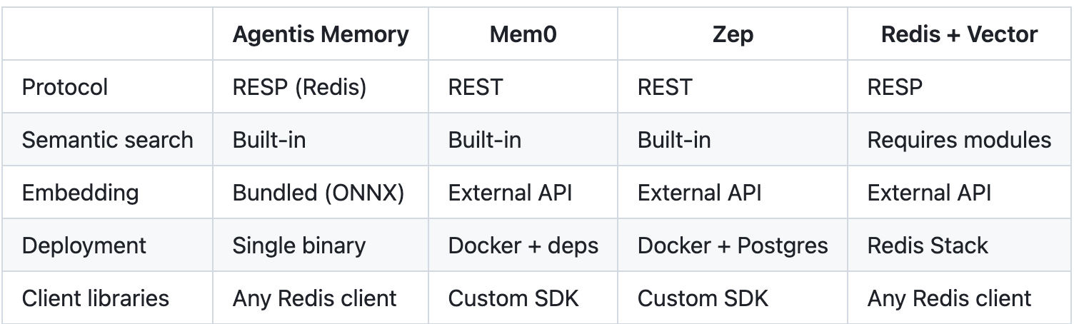 But I want to emphasize the key point: not a single competitor in this table can do MEMSAVE/MEMQUERY out of the box. Agentis Memory is the only one in this comparison that combines this level of KV performance with built-in semantic search in one process, with zero external dependencies.